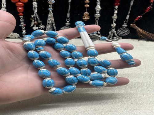 عاج ناب الفيل ملبس فيروز وفضه بالكامل ١٠ مل ٦٥ جرام ٣٣ خرزه