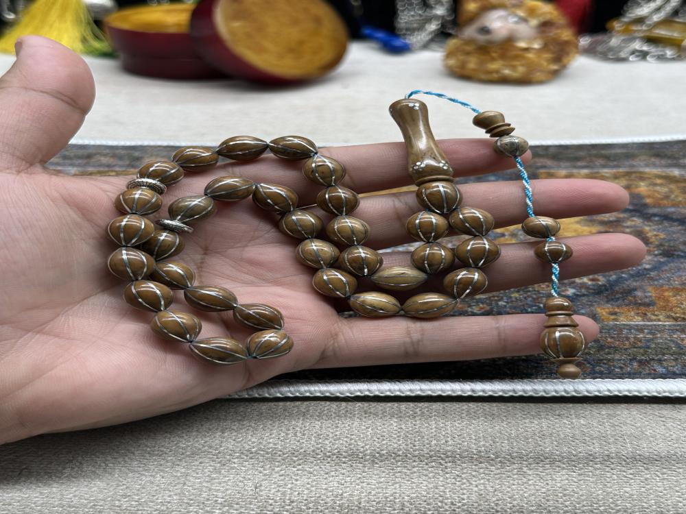 عاج مطعم تراب كهرمان ٣٣ خرزه ملبس فضه بالكامل ٩ مل ٥١ جرام